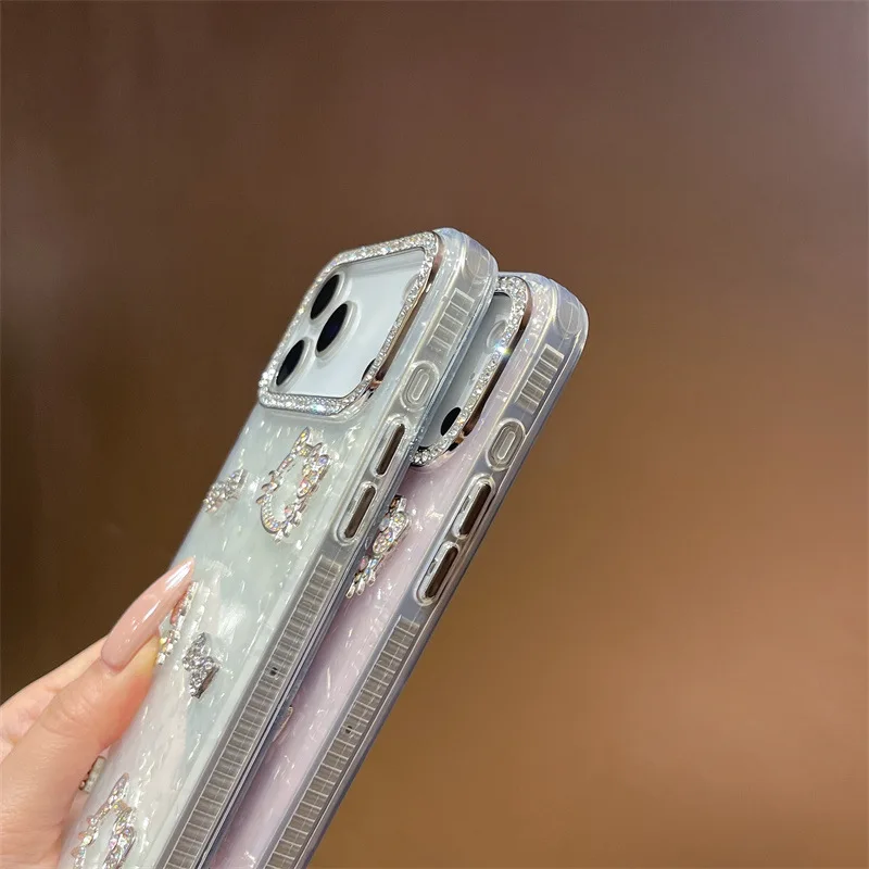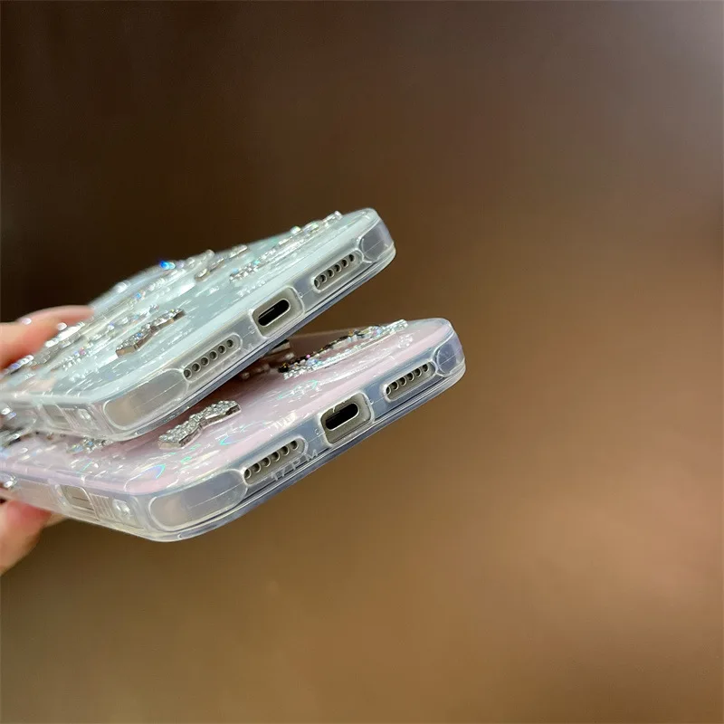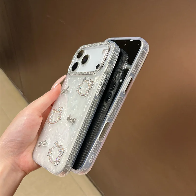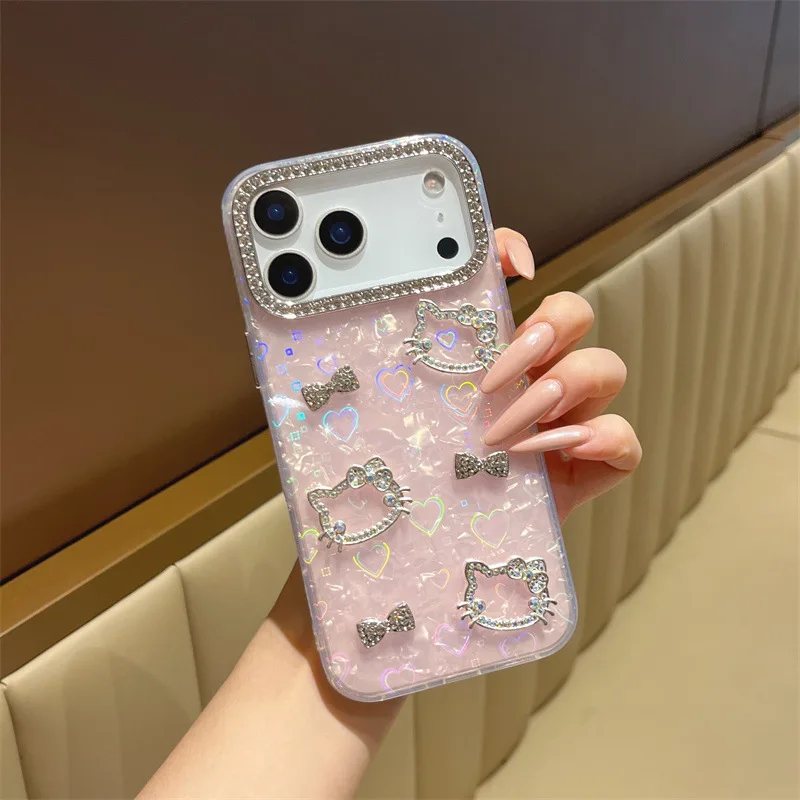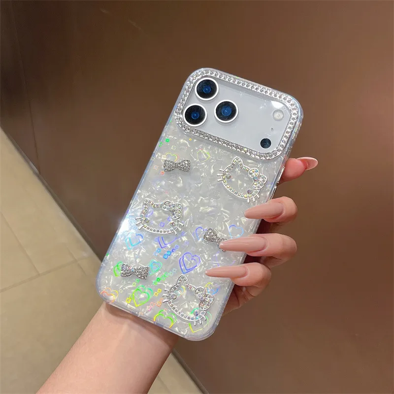 Luxury Glitter Rhinestone Camera Border 3D Hello Kitty Bowknot Shell Pattern Phone Case For iPhone 16 15 14 13 17 Pro Max Cover